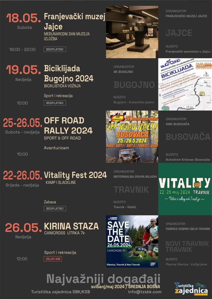 Našoj općini, najzanimljivija dešavanja su Malonogometna utakmica Humanih zvijezda BiH-Hrvatska koja će biti održana na Gradskom stadionu Novi Travnik u četvrtak 16. svibnja, te onima željnim avanture već poznata “Kirina staza” – canicross utrka koja se održava na planini Vilenica, pored Travnika i Novog Travnika. Utrka je na rasporedu u nedjelju 26. svibnja.