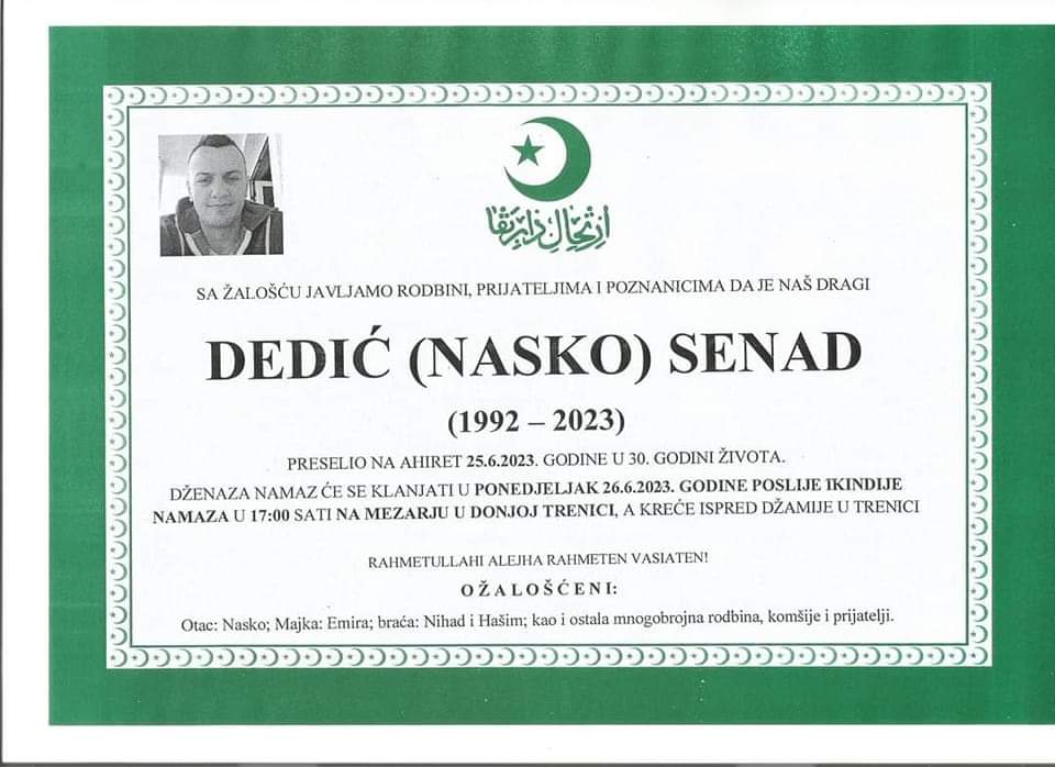 Nakon teških povreda koje je zadobio u prometnoj nesreći prošle sedmice, na drugi svijet je preselio naš Novotravničanin Dedić Senad.