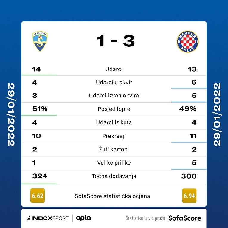 Tragičar utakmice je stoper Šibenika Ivica Batarelo koji je skrivio oba penala za Hajduk. Splićani su ovom pobjedom iskoristili kiks Osijeka koji je doma izgubio od Slavena 1:2. Hajduk je i dalje četvrti s dva boda manje od trećeg Osijeka, ali i s utakmicom manje.