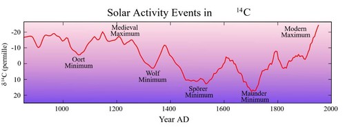 Brajša kaže da je sa svojim kolegama prije desetak godina u časopisu “Astronomy and Astrophysics” objavio dva znanstvena rada o dugodobnim promjenama Sunčeve aktivnosti koristeći podatke o zastupljenosti radioaktivnih izotopa ugljika C-14 i berilija Be-10 sačuvanih u arktičkom ledu (grafikon na temelju C-14 dolje).