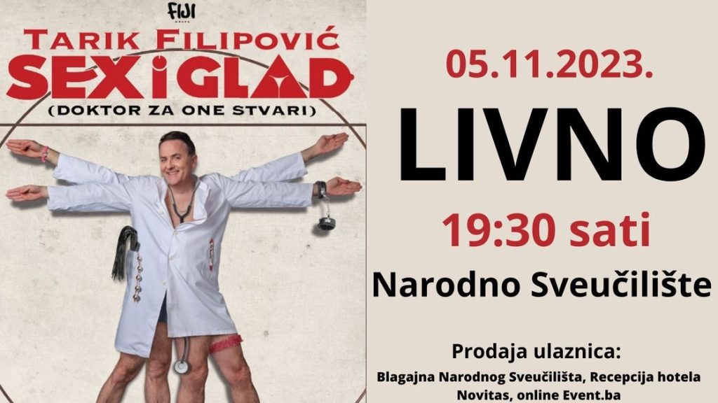 Popularni glumac, rođeni zeničanin sa zagrebačkom adresom Tarik Filipović u nedjelju 05.11.2023. u 19:30 nastupa u Livnu u dvorani Narodnog Sveučilišta sa predstavom “Sex i glad”.
