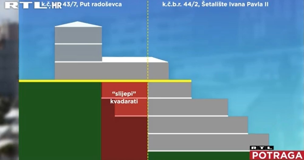 Ekipa Potrage obišla je četiri kaskadne zgrade na Žnjanu u Splitu s četiri različita ulaza na adresi Šetalište Ivana Pavla II. Iznad njih su na odvojenim zemljišnim česticama naknadno sagrađene četiri vile na adresi Put Radoševca.