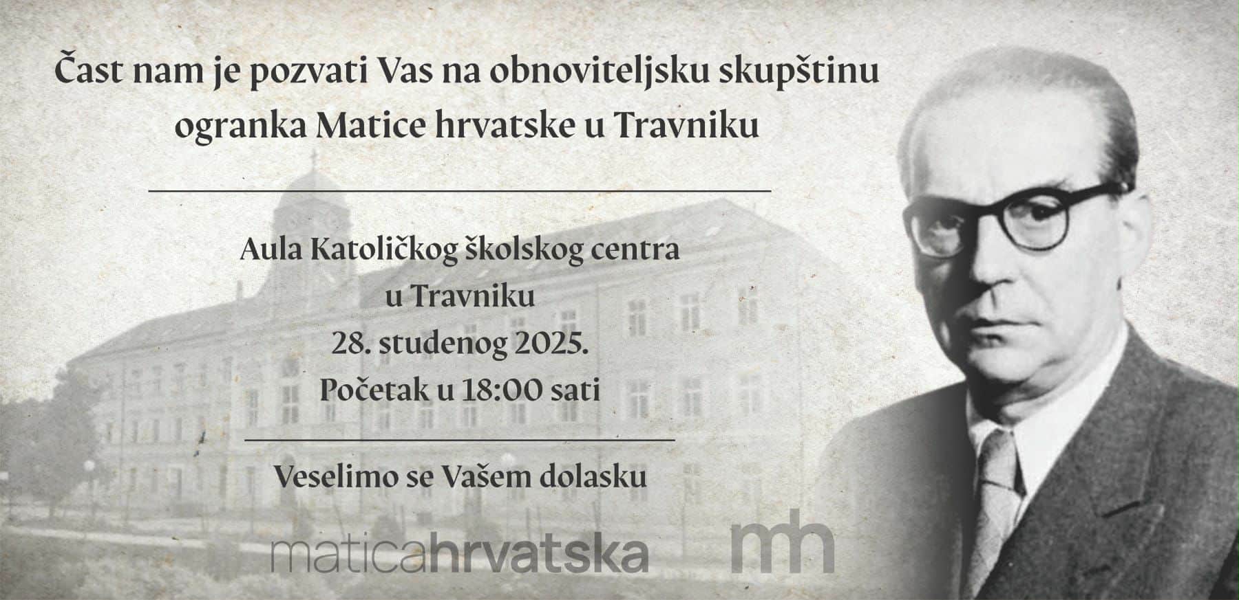 U Travniku će se 28. studenog 2025. ( petak) s početkom od 18.00 sati u Auli Katoličkog školskog centra “Petar Barbarić” održati obnoviteljska skupština ogranka Matice hrvatske Travnik, jednog od najvažnijih kulturnih događaja za Hrvate u Travniku i središnjoj Bosni u posljednjem desetljeću.