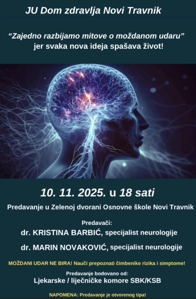 Dom zdravlja Novi Travnik u ponedjeljak 10.11.2025.godine u Zelenoj sali Osnovne škole Novi Travnik organizira predavanje pod.nazivom “Zajedno razbijamo mitove o moždanom udaru-jer svaka nova ideja spašava život”.