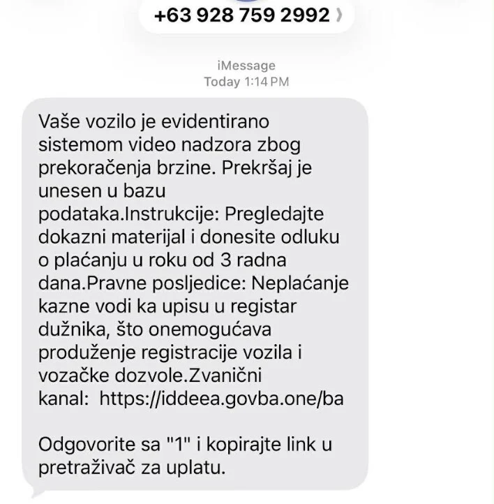 “Građanima se šalju poruke u kojima se lažno navodi postojanje saobraćajnih kazni, hitnih rokova za plaćanje, pravnih posljedica i navodnih registara dužnika, uz dostavljanje sumnjivih internet linkova koji nemaju nikakve veze sa zvaničnim sistemima institucija Bosne i Hercegovine”, saopćeno je iz IDDEEA-e.