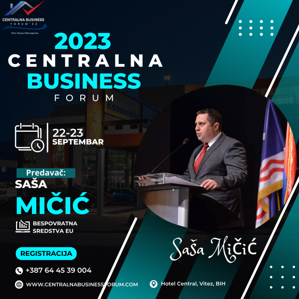 Pozivamo Vas da prisustvujete jednodnevnoj stručnoj edukaciji na temu ”Pisanje projekata za bespovratna sredstva iz EU fondova (IPA III)”, koja će se 23.09.2023. godine održati u Vitezu, u sklopu Centralna Business Foruma, koji se održava 22./23.09. u hotelu Central u Vitezu.