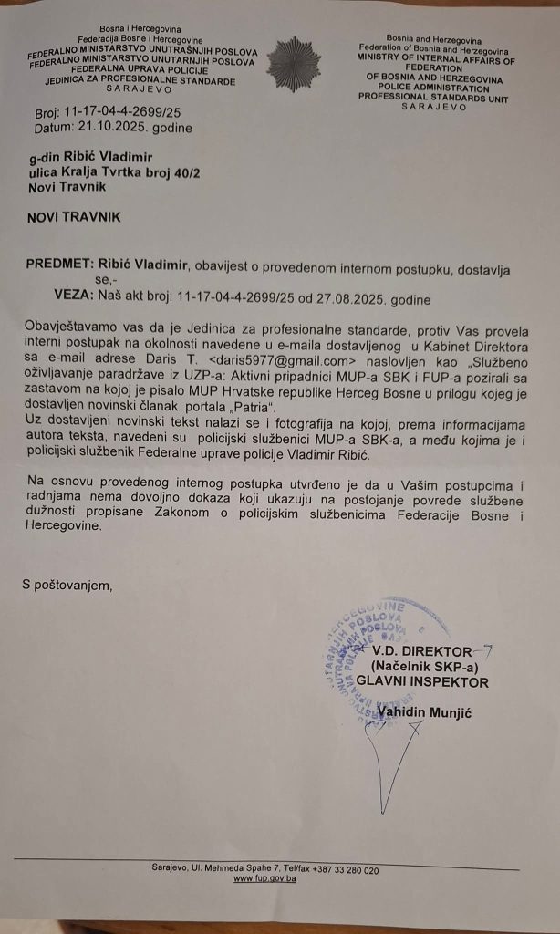 Disciplinski postupak pokrenut protiv Vladimira Ribića iz Novog Travnika, zbog isticanja zastave MUP-a HR Hrvatske republike Herceg Bosne na privatnom druženju, okončan je u korist optuženog. Nadležna komisija donijela je odluku da u njegovom postupanju nije bilo elemenata povrede službene dužnosti te je Ribić u potpunosti oslobođen odgovornosti.