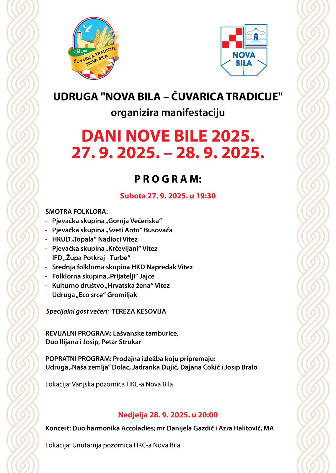 UDRUGA “NOVA BILA – ČUVARICE TRADICIJE” sa zadovoljstvom najavljuje manifestaciju ,,DANI NOVE BILE 2025.”, koja će se održati 27. i 28. rujna 2025. godine u prostorijama i na pozornici Javne ustanove Hrvatski kulturni centar Nova Bila.